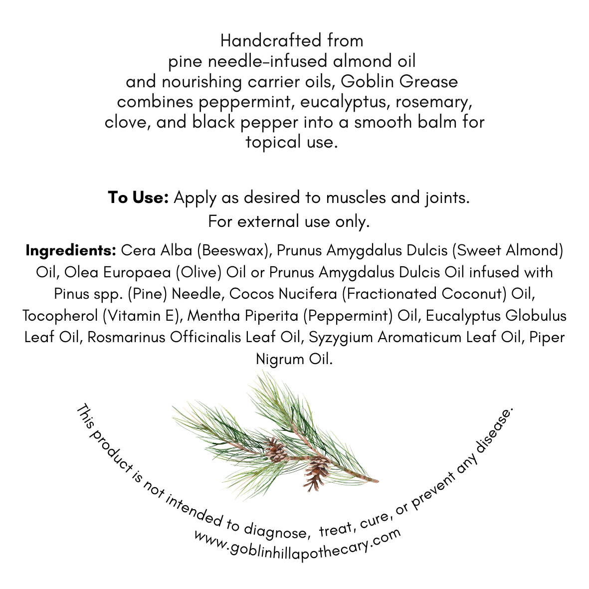 Goblin Grease is a mischievous mix of pine needle infusion, peppermint, eucalyptus, rosemary, clove, and black pepper, blended into rich almond and coconut oils. Smooth onto tired muscles and stiff joints for a cooling, invigorating sensation. Cozy forest vibes, no goblin magic required.
